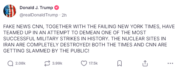 空袭过去三天了,特朗普的社交媒体账号内容还是“彻底摧毁”言论刷屏。美国官员和媒体宣称“彻底摧毁”伊朗核设施的言论被他一条接一条转发,他还在一条声明里用全大写字母强调,CNN和《纽约时报》都是“假新闻”,空袭伊朗是“历史上最成功的军事打击之一”。