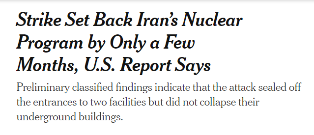 《纽约时报》也报道说,美军的打击仅封住了两个核设施的入口,并没有摧毁其地下建筑。伊朗核项目发展或将延迟,但预计延迟时间不会超过6个月。