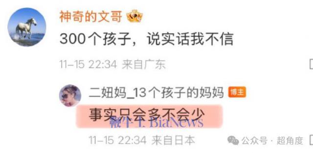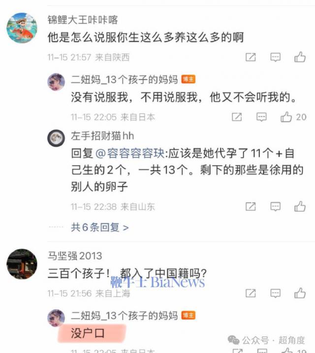 徐总是怎么说服她生这么多、养这么多的呢?她回复"没有说服我,不用说服我,他又不会听我的"。此外她称 300 个孩子没户口。