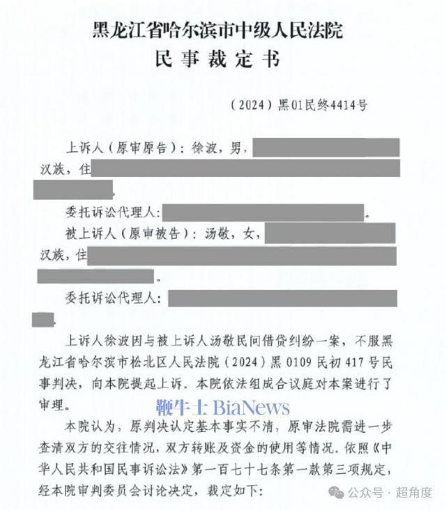 黑龙江省哈尔滨市中级人民法院出具民事裁定书指出:原判决认定基本事实不清,原审法院需进一步查清双方的交往情况,双方转账及资金使用等情况。