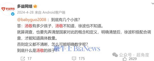 多益网络称在去年发文称,汤敬有多少孩子,汤敬不知道,徐波也不知道。
