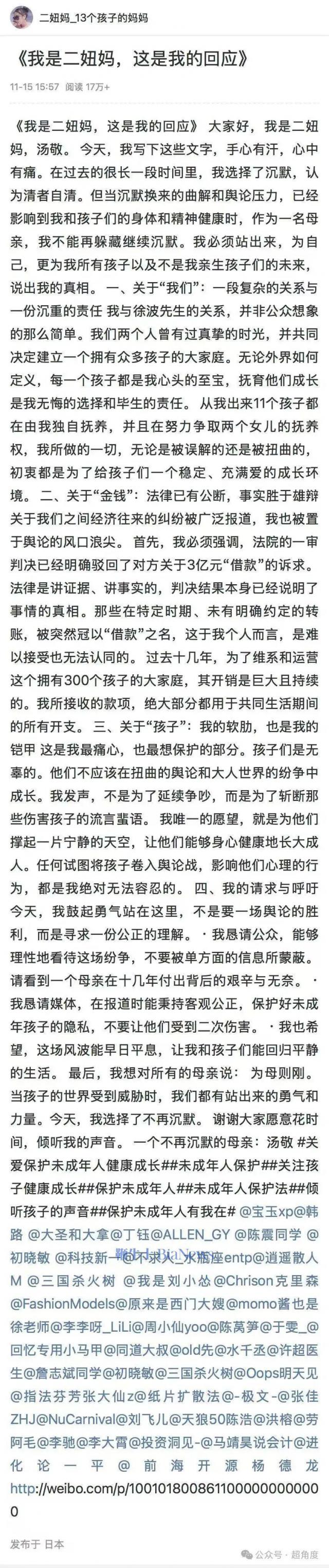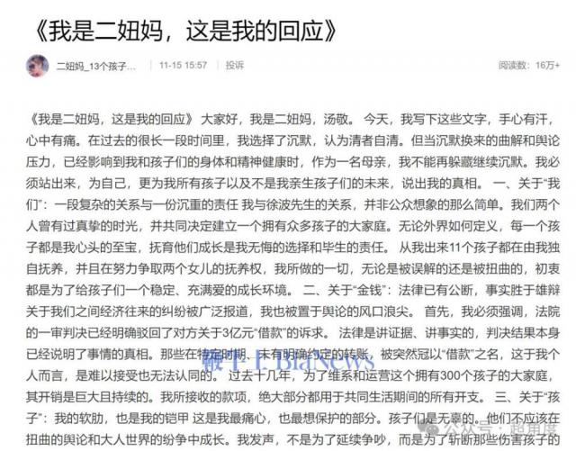 徐波称汤敬举证了 13 个孩子,仅其中 2 人是双方共同生育,而其他 11 人是汤敬在国外接受捐精所生。