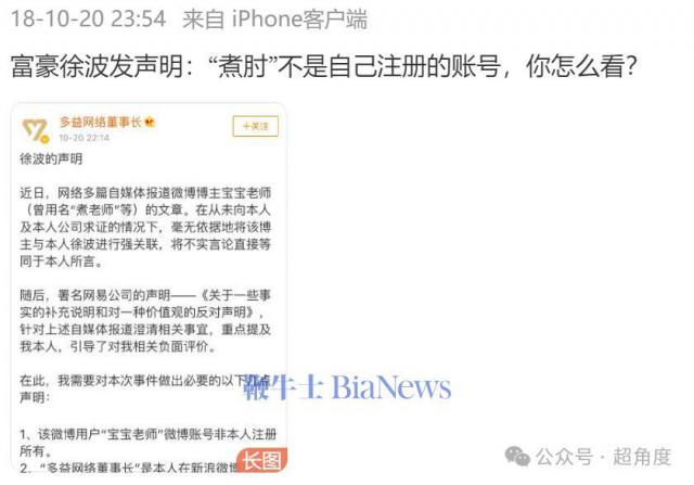(不过,2018 年徐波在多益网络董事长账号发声明称,宝宝老师,曾用名"煮老师"等,非本人注册所有。)