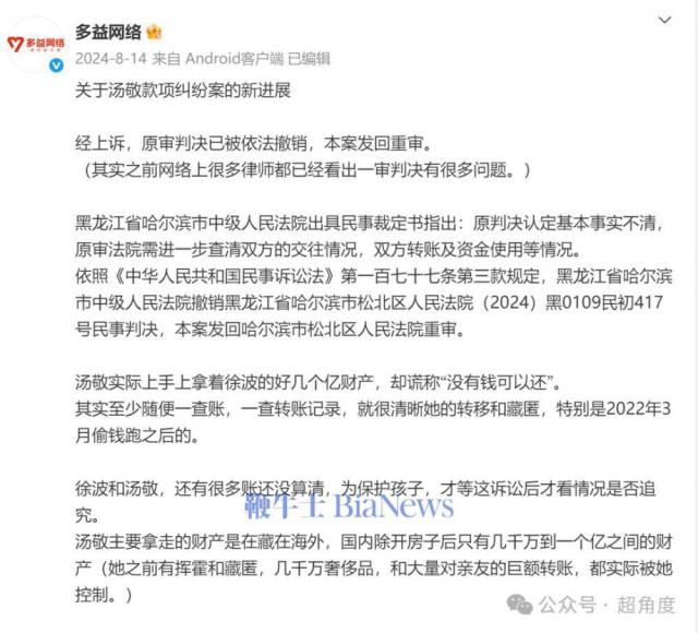 2024 年 8 月 14 日,多益网络发文公布徐波与汤敬款项纠纷案新进展,经上诉,原审判决已被依法撤销,本案发回重审。